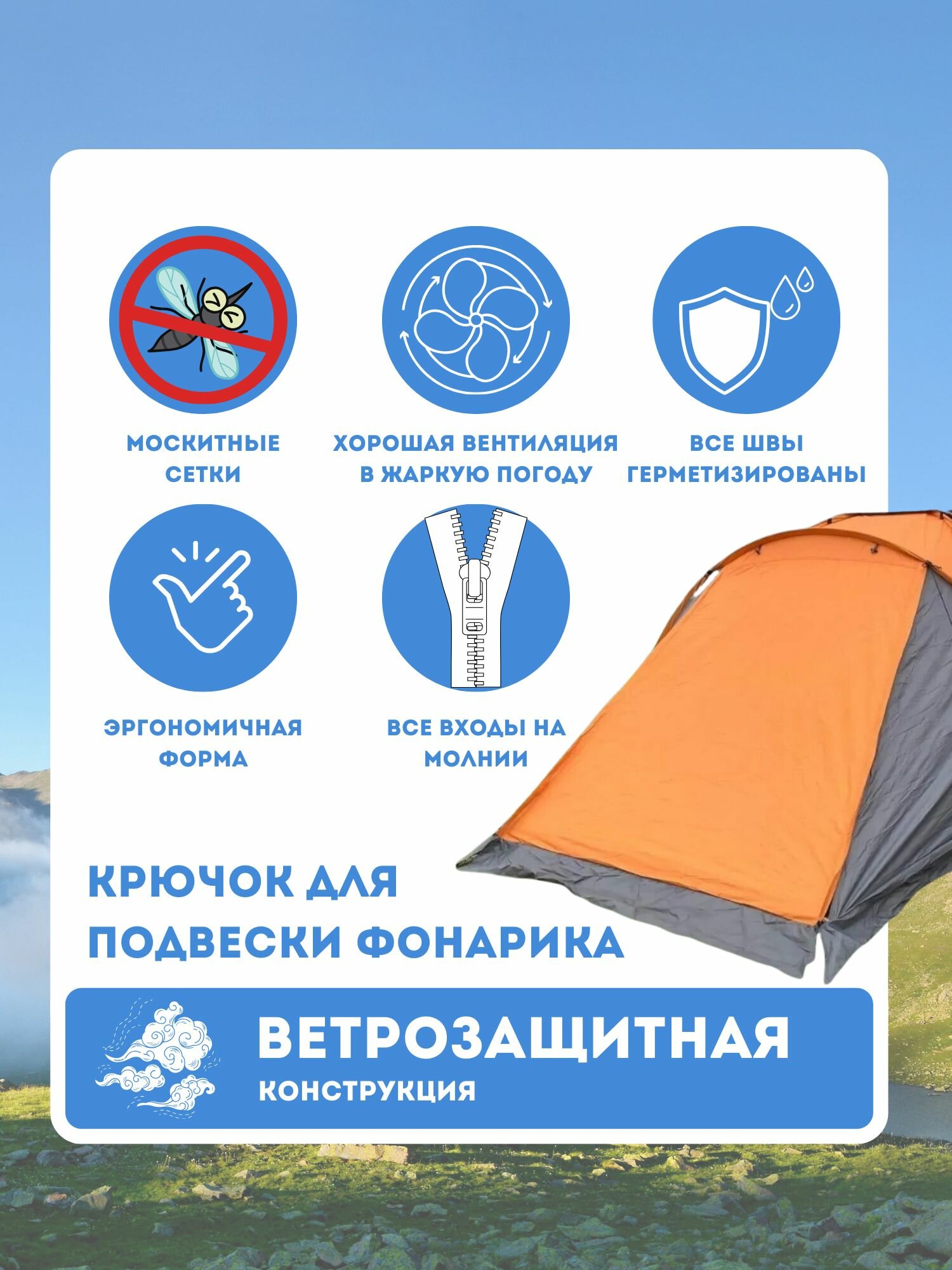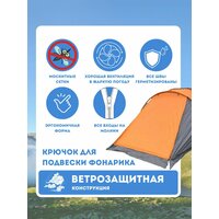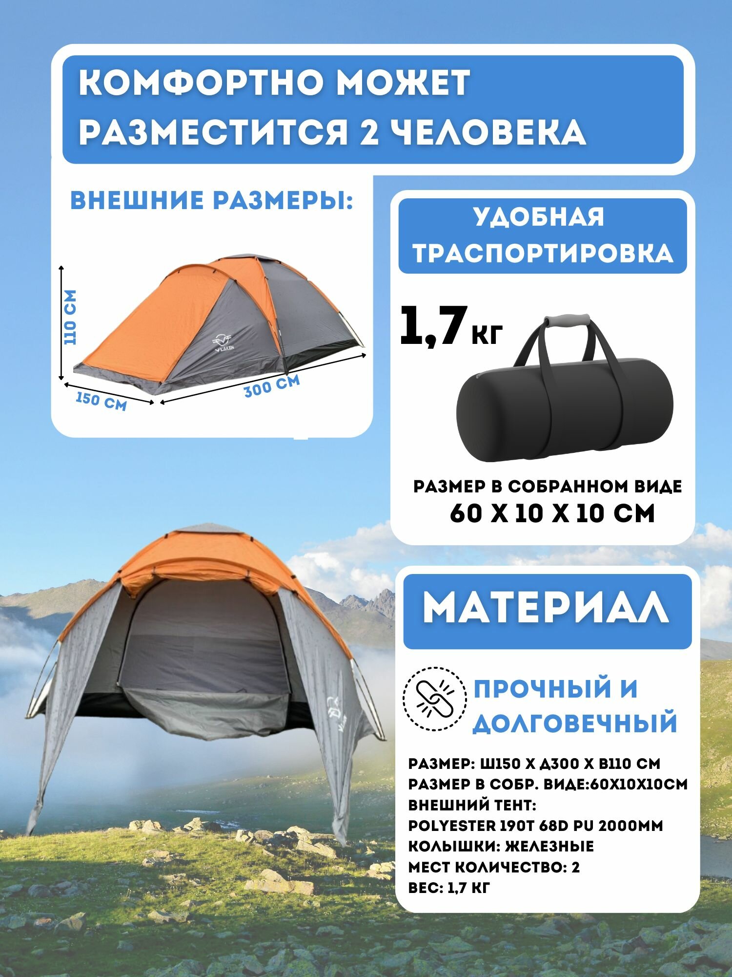 Палатка оборудована прочными дугами и армированной пленкой для дна, что обеспечивает надежность и долговечность конструкции. Вес палатки составляет всего 1,7 кг, что облегчает транспортировку и установку.