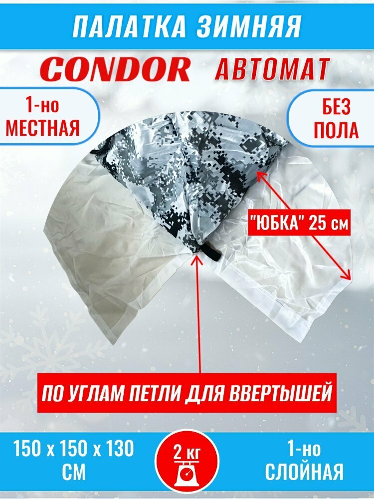 Купить Палатка CONDOR автомат зимняя 1.5 Х 1.5 X 1.3 м, КМФ белый без пола с доставкой по всей России. Палатка CONDOR автомат зимняя 1.5 Х 1.5 X 1.3 м, КМФ белый без пола: сравнение цен, характеристики, фото, актуальное наличие и цены.