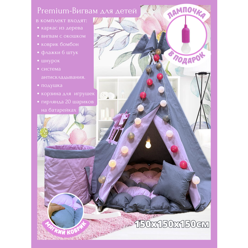вигвам с окошком, коврик бомбон, подушка, корзина для игрушек, гирлянда-шарики на батарейках, флажки на верхушку, каркас, лампочка в подарок