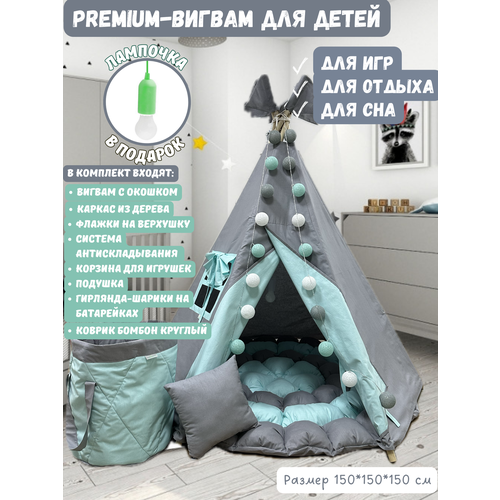 вигвам с окошком, коврик бомбон, подушка, корзина для игрушек, гирлянда-шарики на батарейках, флажки на верхушку, каркас, лампочка в подарок