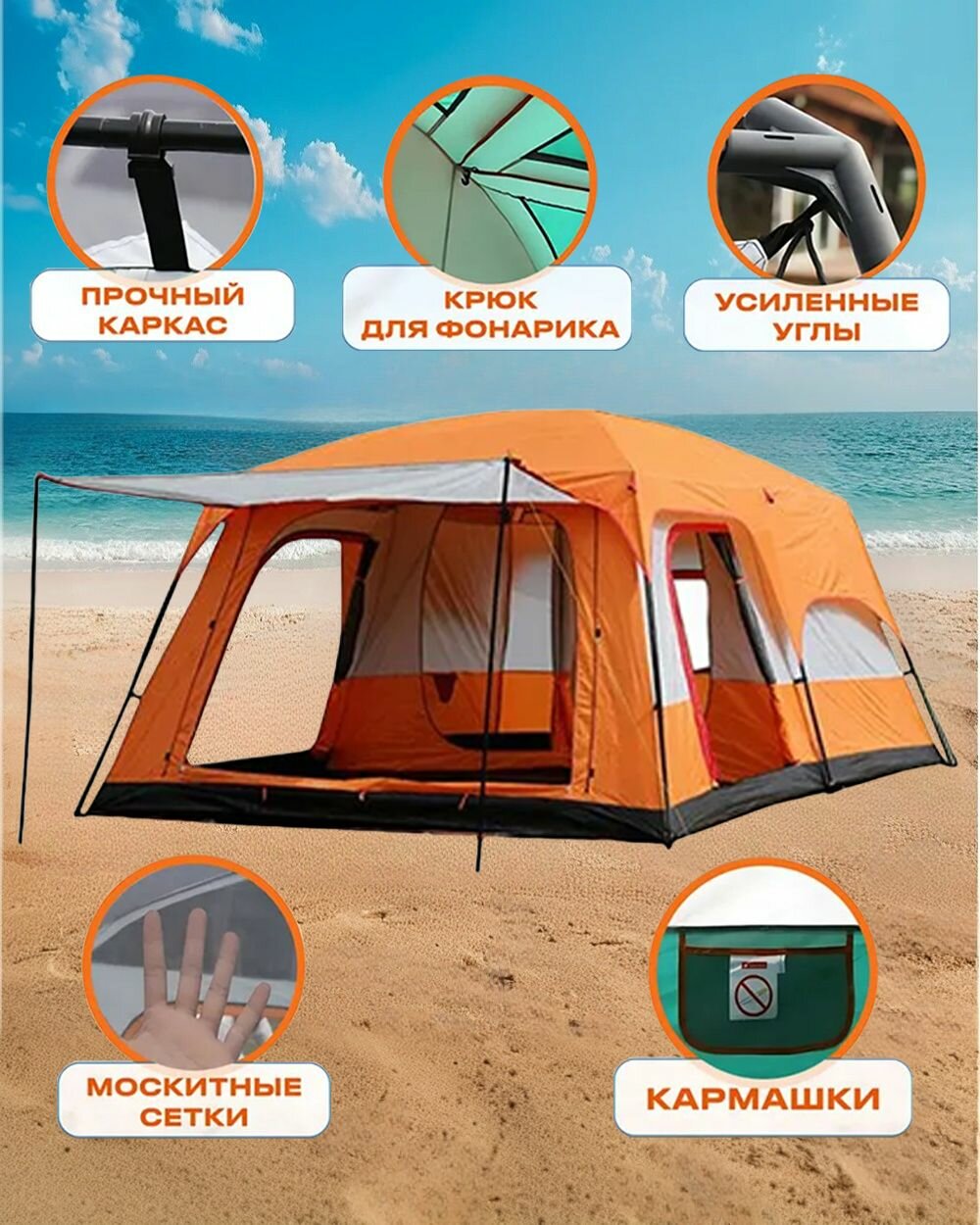 вентиляционные отверстия, ветрозащитная/снегозащитная юбка, внутренняя палатка, возможность крепления фонарика, навес, подвесные полки, противомоскитная сетка, усиленные углы, штормовые оттяжки