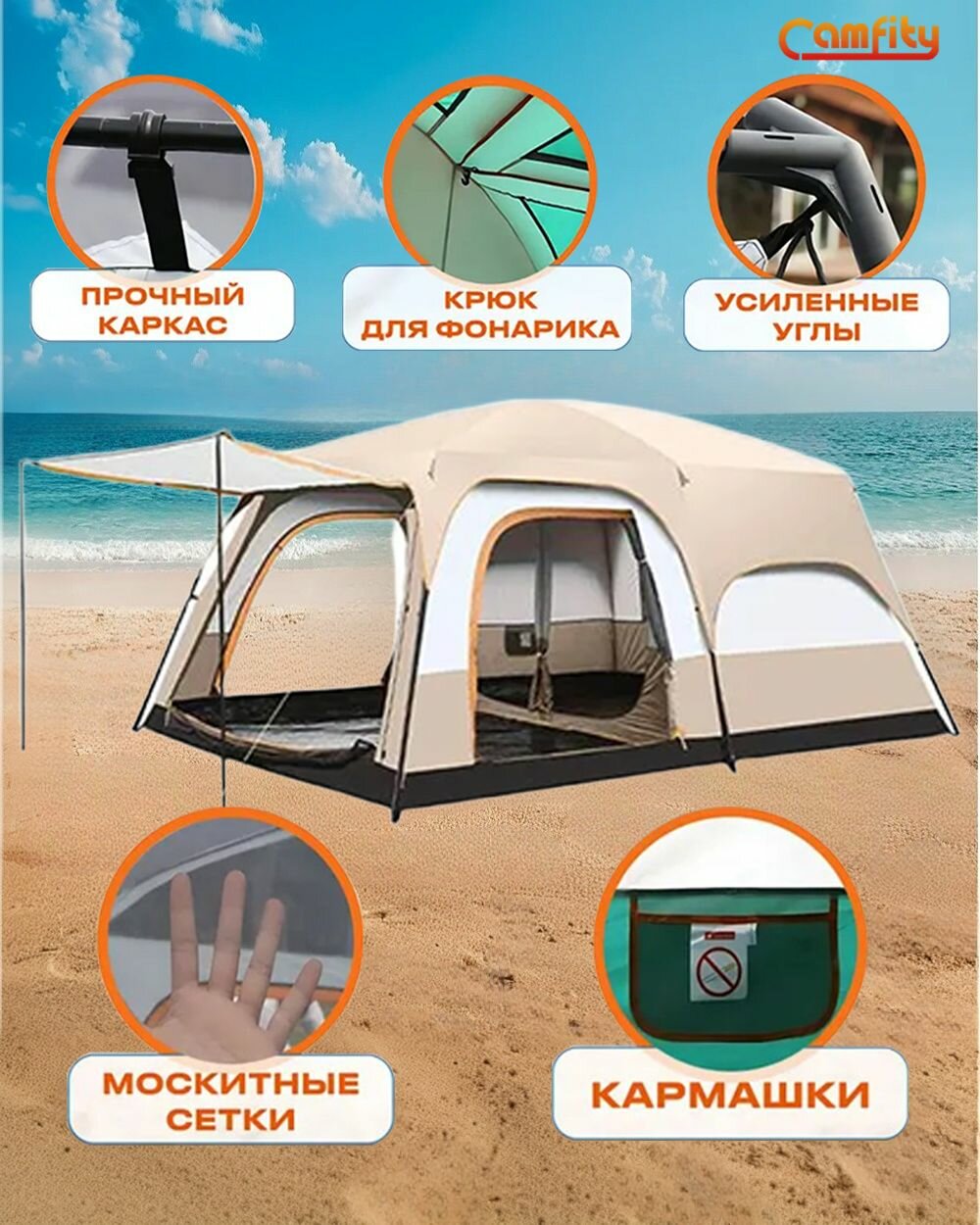 вентиляционные отверстия, ветрозащитная/снегозащитная юбка, внутренняя палатка, возможность крепления фонарика, навес, подвесные полки, противомоскитная сетка, усиленные углы, штормовые оттяжки