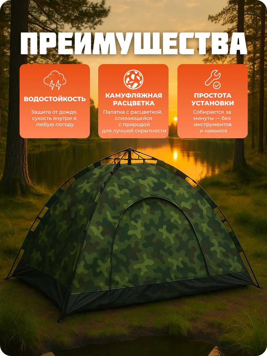 При выборе камуфляжной кемпинговой палатки вы можете руководствоваться теми же факторами, что и при выборе обычной палатки. Вы можете найти камуфляжные модели различных типов, таких как купольные или шатровые палатки.