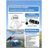 Вместительность 4 человека. Пришитый к внутренней палатке водонепроницаемый пол позволяет организовать сухое и чистое пространство в тамбуре для инвентаря.