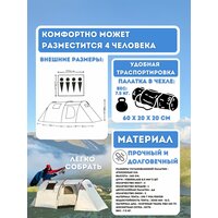 Двухслойная палатка предназначена для туризма и рассчитана на четверых человек. Вместительный тамбур позволяет не только разместить инвентарь, но и поставить кресло с небольшим столиком. При этом водонепроницаемый тент укроет от дождя, а москитная сетка защитит от комаров. Характеристики: Размеры установленной палатки : 470 х 220 х 160 см. Высота : 160 см. Дуги : Fiberglass 8,5 мм х 3 шт Количество мест : 4 Количество входов : 1 Двухслойная палатка : да Количество окон : 3 Материал тента : 190 T Polyester Водостойкость тента : 3000 мм / в. с. Материал дна : Плетеная ткань ПВХ 120 гр. Москитная сетка : есть Вес : 7.5 кг.