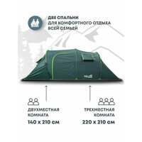 Палатка разделяется на 2 независимых спальни – на 2 и 3 спальных места, между которыми находится тамбур. Такая компоновка дает множество вариантов использования, например, если вы планируете ночевать вдвоем или втроем, то можно закрепить всего одну спальню и тем самым увеличить тамбур до размеров полноценного шатра и с комфортом расположиться там со столом и стульями, либо использовать его дня хранения вещей и велосипедов.