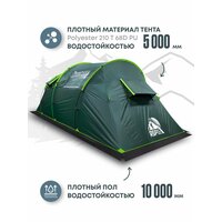 Палатка изготавливается из прочного материала Polyester 210T с показателем водонепроницаемости 5000 мм, которого с запасом хватит что бы уберечь Вас и Ваши вещи от любой непогоды. Пол палатки изготовлен из материала высокой плотности Tarpayling– легкого и эластичного, но в то же время обладающего высокой прочностью и водонепроницаемостью 10 000 мм. Каркас сделан из высококачественных фиберглассовых сборных дуг диаметром 11 мм. с металлическими наконечниками, они обладают хорошей гибкостью и большим запасом прочности. Благодаря сочетанию таких материалов и крепкого каркаса удалось достичь максимальной прочности конструкции, которая выдержит любой ветер, а дополнительную устойчивость дают штормовые оттяжки, прошитые светоотражающей нитью что бы быть более заметными в темное время суток. Абсолютно все швы и молнии в палатке защищены специальной термоусадочной лентой что бы исключить протекание во время дождя.