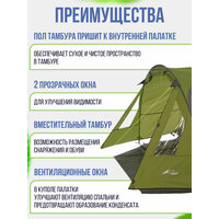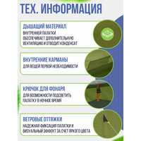 внутренние карманы, проклеенные швы, вентиляционные отверстия, окна, противомоскитная сетка, внутренняя палатка, тамбур, штормовые оттяжки, возможность крепления фонарика, 1 комната
