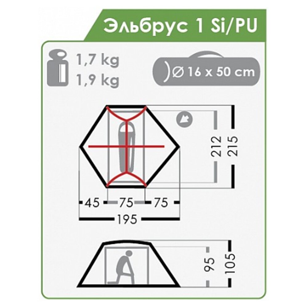 Сверхлёгкая трёхсезонная палатка Normal Эльбрус 1 Si/PU с увеличенным внутренним объемом. Тент из легкой и прочной ткани 40D Nylon Taffetf R/S Si/PU с проклеенными швами. Быстрая сборка. Увеличенное внутреннее пространство. Особенности: Тент из легкой и прочной ткани 40D Nylon Taffeta R/S Si/PU с проклеенными швамиСпециальная конструкция каркаса образует увеличенное внутреннее пространствоБыстрая сборка каркаса — за счет соединения всех элементов вместе резиновыми шнурами и алюминиевыми хабамиПовышенный комфорт за счет вертикальных стенок внутренней палаткиСеточка на входах, образующая сквозную вентиляцию, может закрываться тканью в холодную погоду1 вход и 1 тамбурКарманы из сетки. Подвесная полочкаМаксимальный комфорт при минимальном весе (увеличенный объем за счет вертикальности стенок)Характеристики: Габаритные размеры тента, см: 215х195х105Габаритные размеры внутренней палатки, см: 215x75x95Каркас: SP-Aero 3D, основные дуги 9,5/8,5 mm, коньковая дуга 8,5 mmГерметизация швов: термоусадочная лентаФурнитура: металлополимернаяПодвесной карман-полка: естьБоковые карманы: естьВентиляционные окна на тенте: 2Прозрачные окна: нетВетрозащитная юбка: нетКомплектация: Колышки - 12 шт. Оттяжки 2,5м - 2 шт. Оттяжки 2м - 4 шт. Оттяжки 0,5м - 5 шт. Фиксаторы - 6 шт.