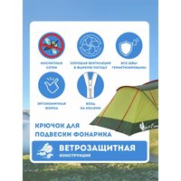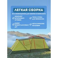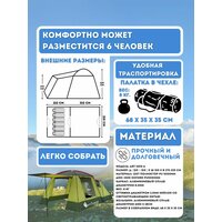 Палатка MirCamping ART1500-6 - это просторное сооружение, идеально подходящее для отдыха на природе. Преимущества модели: Вместительность для использования как гостиной, места для хранения, кухни на природе и уютного места для приема пищи. Высота палатки 220 см, с большими окнами с москитными сетками для проветривания. Три входа: два в спальные отсеки и один в шатер. Двухслойная конструкция для защиты от конденсата и промокания. Внешний тент изготовлен из прочного материала с высокой водостойкостью. Внутренний спальный модуль из воздухопроницаемого материала для комфортного отдыха. Прочное дно защищает от проникновения влаги. Может разместить до 6 человек, но часто используется для 4-5 человек для большего комфорта. Легкое хранение и компактность в сложенном виде. Надежный каркас и простая схема сборки. Внутренний модуль с карманом для мелочей, петельками для фонарика и москитными сетками.