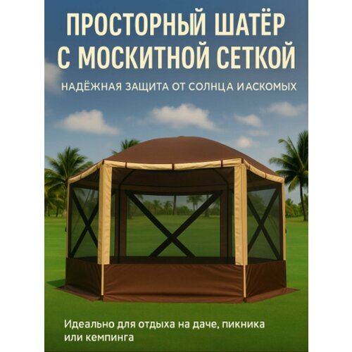 Палатка-шатер на 6 мест - идеальное решение для комфортного отдыха на природе большой компанией. Просторное внутреннее пространство позволит разместить всех участников похода с удобством, а надежная конструкция обеспечит защиту от непогоды. Легкая сборка и компактные размеры в сложенном виде делают ее удобной для транспортировки. Палатка-шатер станет вашим надежным домом вдали от городской суеты, создавая атмосферу уюта и комфорта для незабываемых приключений.
