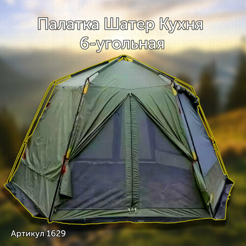 Палатка Шатер Кухня 430х430х230, 6-угольная туристическая с москитной сеткой (высота 180-230см)Беседка повышенной вместимости! Шатер выполнен из водонепроницаемой ткани с москитной сеткой. В пасмурную погоду защитит от дождя, в солнечную - укроет от жары. За счет москитной сетки обеспечивает проветривание шатра в жаркую погоду и не пропускает насекомых. Отлично подойдет для отдыха большой компании на природе или на даче. Шестигранный, вход с 2х сторон, прост в установке. Стальной каркас обеспечивает прочность и устойчивость при ветреной погоде. Внутри шатра можно разместить стол со стульями, походное снаряжение, а также использовать как зону отдыха. Особенности шатра:- Водонепроницаемость тента - 5000 мм водяного столба - Каркас из стальных дуг: диаметр 19 мм - Материал тента - Oxford 190T PU. Ткань изготовлена из полиэфирных волокон с полиуретановым покрытием - Высота , см 180/230 см. - Материал каркаса сталь. - Материал соединений металл - Назначение Для защиты от солнца и дождя. - Количество входов: 2 - Размер в упаковке 110х20см. - Размер пола 430х430 см. - Шатер оборудован москитными сетками. - Стенки шатров можно как опускать так и поднимать. - Вес 9 кгХарактеристики шатра: Размер шатра: 4,3 на 4,3 метра Материал тента: Oxford 190T PU 5000 мм. Высота шатра: 2,3 метра в центе, и 1,8 метра по краям. Стальной каркас, труба 19 мм. Палатка туристическая, туристическая палатка, палатка для рыбалки, палатка для кемпинга, отдых на природе, водостойкая палатка, палатка с тамбуром, палатка двухместная, автоматическая палатка, палатка автоматическая профессиональная, профессиональная палатка, шатер, беседка для летнего отдыха.