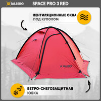 Описание палатки Talberg Space Pro 3 Red TLT-022R: Палатка имеет ярко-красный цвет тента, что немаловажно, при использовании в условиях высокогорья. Простая и быстрая установка, Вы можете установить палатку в течение 3-5 минут. Рассчитанная на трех человек палатка, имеет идеальное соотношение объем-вес и удобную сумку для переноски. Благодаря использованию внешнего каркаса, палатка получила повышенную ветроустойчивость и возможность быстро установить тент и укрыться от непогоды, без установки внутренней палатки, в тамбурах можно разместить необходимое количество снаряжения, а так же приготовить пищу на горелке, во время непогоды. Внешний тент надежно защищает от сильного ветра и атмосферных осадков. Двухслойная конструкция палатки отлично испаряет конденсат и способствует комфортному проживанию в походных условиях. Юбку палатки можно быстро подвернуть, благодаря специальным затяжкам. Модель рекомендуется для использования круглый год, включая зимний период.