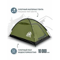 Палатка двухместная непромокаемая. Тент изготовлен из прочного и в то же время легкого материала Polyester 190T 63D с показателем водонепроницаемости 3000 мм. водного столба, что является очень высоким показателем и способен выдержать любой дождь, а швы палатки надежно защищены от протекания с помощью термоусадочной ленты. Тент палатки имеет защиту от УФ-излучения и пропитку задерживающую распространение огня. Дно палатки изготовлено из армированного полиэтилена – терпаулинга, который является очень крепким материалом с показателем водонепроницаемости 10 000 мм. водного столба, так что палатка непромокаемая.