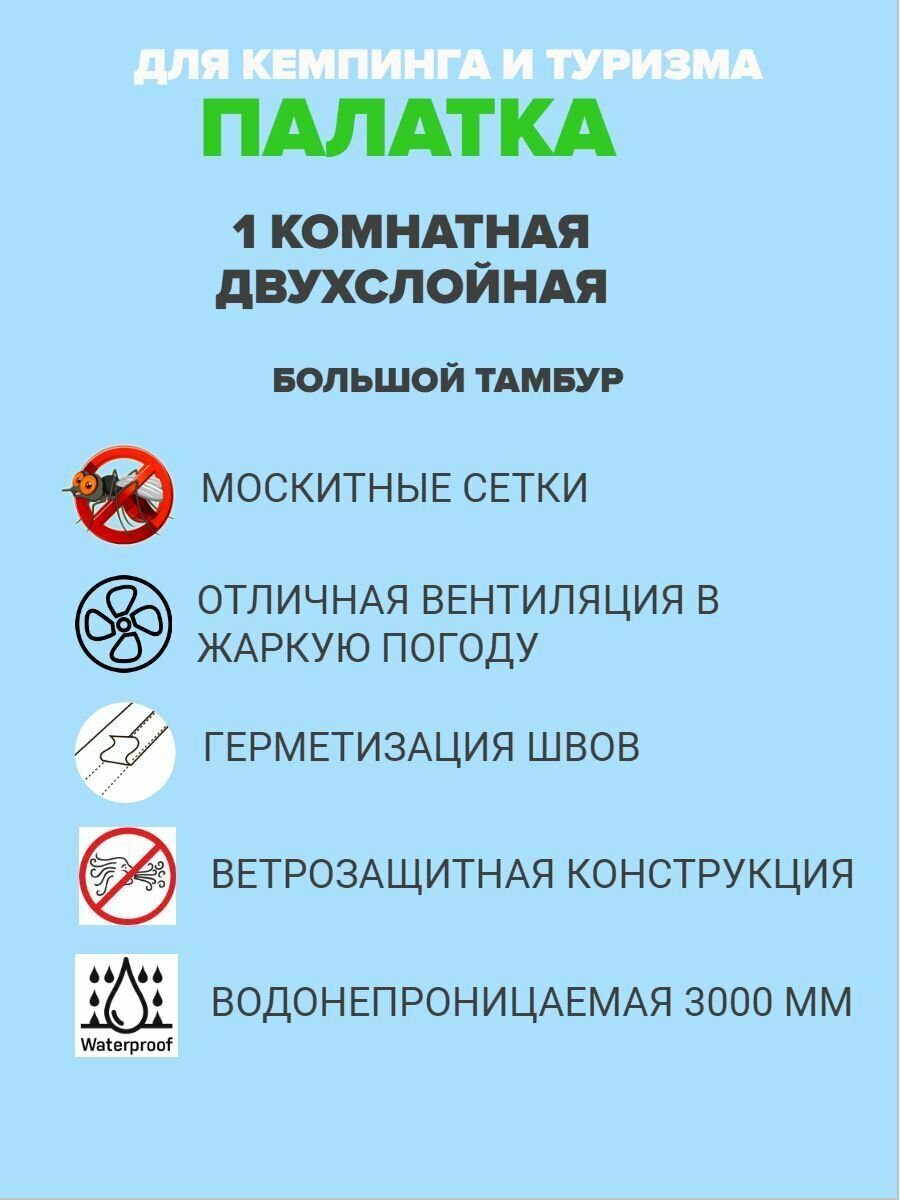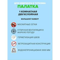 • Каркас: Фибергласовые дуги • Материал (внешний): 190D Полиэстр PU3000 мм в. с. • Материал (внутренний): 190Т дышащая ткань • Москитная сетка: есть • Герметизация швов: да