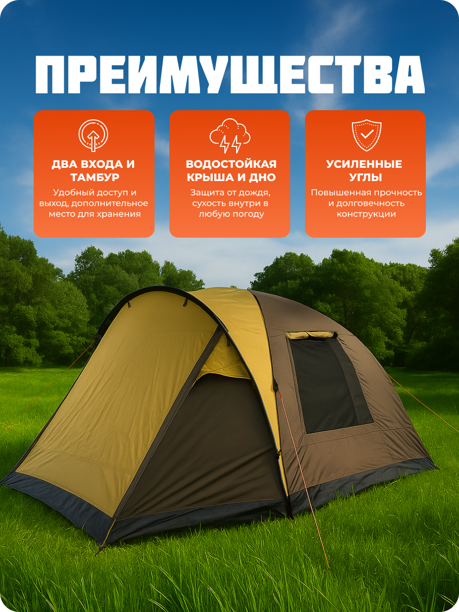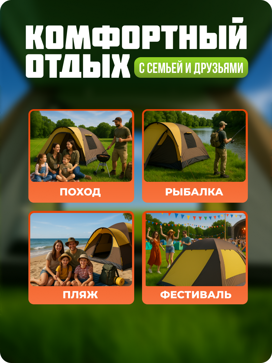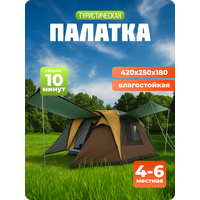 Внимание: огромная просьба при получении палатки , не вскрывать коробку канцелярским ножом, Вы можете повредить ее целостность! Благодарим за понимание! -Размер(внешний): Ш250*Д(120+220+80)*В180СМ -Материал:420D OXFORD PU2000ММ -Внутреняя палатка: POLYTAFFATA 190Т 68D B/R +B3 MESH дышащий полиэстер -Пол: Армированный PE -Количество человек:4-6 -Каркас: стальной16ММ*2 -Вес:10.4кг -Колышки D5MM * 18CM Металл -Размер упаковки: 60*18*18см У нас представлен большой выбор кемпинговых , туристических, экстремальных палаток, шатры летние садовые для дачи, туристические кухни, мобильные бани, зимние палатки куб, для рыбалки и охоты, с тамбуром и без, с москитными сетками, детские палатки игровые, пляжные тенты палатки, одноместные, двухместные, 3,4 местные и большие просторные, все для отдыха и туризма с полным комфортом, кемпинговая мебель, туристическая посуда, термосы, туристические походные рюкзаки мужские , женские и детские.