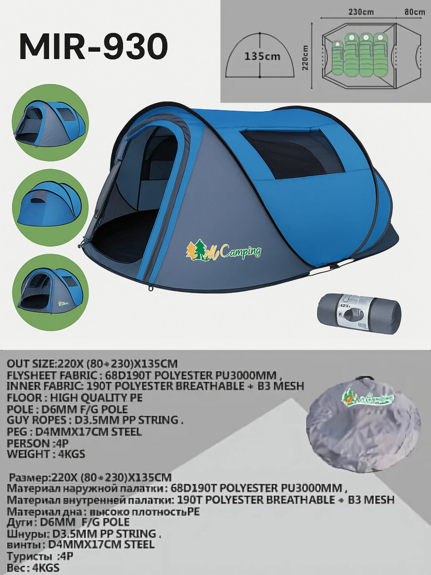 4-х местная туристическая палатка автомат высокого качества. Два входа, один тамбур, два окна, нет ветрозащитной юбки, москитная сетка на входах и окнах. Подходит для туризма, кемпинга, может использоваться как палатка для рыбалки, охоты или пляжа. Очень быстро собирается и разбирается. Размер (ДхШхВ): (80+230)х220х135 см. Материал: внешней палатки - 68D190T полиэстер PU 3000 мм, внутренней палатки - 190T дышащий полиэстер + B3 Mesh сетка, дно - высокой плотности PE PU 3000 мм. Каркас - сплошной F/G d=6 мм.
