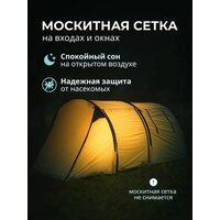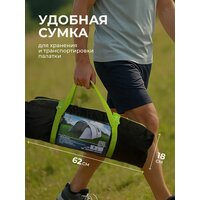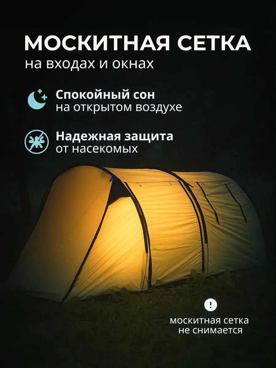 Высота 4-х местной палатки составляет 160 см. ширина 220 см, длина спального места 255 см. а общая длина палатки с учетом тамбура 470 см. В такой палатке с комфортом могут разместиться четыре человека, поскольку площадь спальных мест составляет 220х255 см. От комаров защитит москитная сетка. Тенту из прочной полиэстеровой ткани с водостойкостью 3000 мм в. ст. не страшен дождь, поскольку швы защищены от протекания гидроизолиролирующей лентой, а система штормовых оттяжек обеспечивает устойчивость палатки при сильном ветре, а также отводит дождевые потоки, стекающие по тенту, в стороны от внутренней части палатки. Для предотвращения скопления воды под палаткой её необходимо устанавливать на ровном месте, избегая низин.