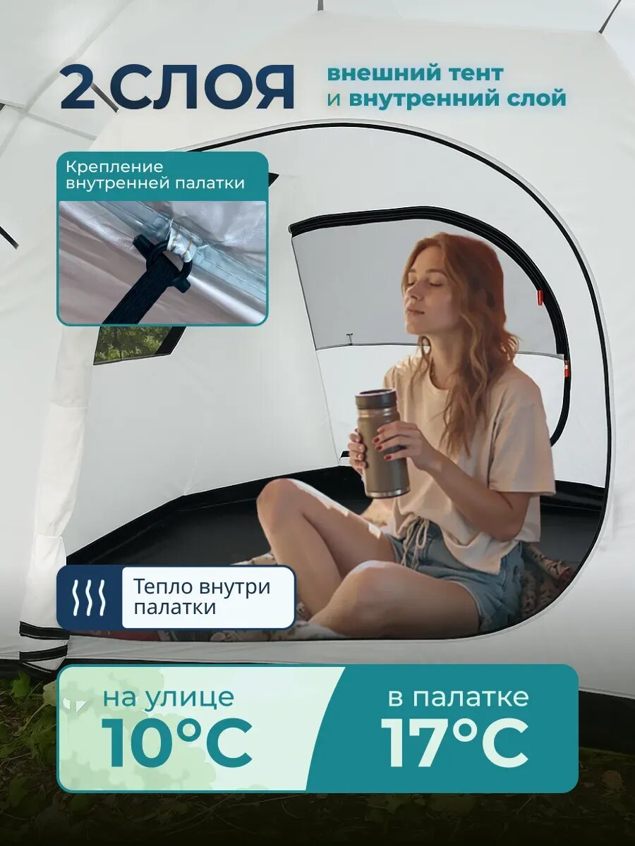 Внутренняя четырехместная палатка защищена от конденсата продуманной системой вентиляции, что обеспечивается расположением окон в палатке. Мелкоячеистая москитная сетка на окнах отлично пропускает воздух, но не позволяет проникнуть внутрь даже самых мелким насекомым. Дышащая ткань и окна позволяют проветриваться внутренней части палатки в жару. Армированный пол повышенной прочности защитит внутреннее пространство палатки от проникновения влаги. Для удобства отдыхающих предусмотрены карманы для мелочей и подвес для фонаря на потолке.