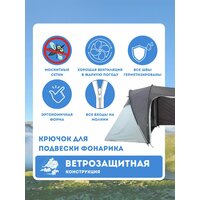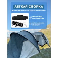 Особенность данной модели в том, что ней три изолированные комнаты. В данной модели большой тамбур, где можно сложить свое снаряжение и обувь. Водонепроницаемый тент скроет Вас от дождя, а москитная сетка на входе во внутреннюю палатку укроет Вас от комаров. Кемпинговая палатка прекрасно подойдет для семейного или туризма совместно с друзьями. Все швы проклеены Тент обладает высокой водонепроницаемостью 2500 мм водяного столба На окнах и входе в палатку москитная сетка Дуги на основе стекловолокна и эпоксидных смол - легкие и прочные Водонепроницаемый чехол с переносными ручками и компрессионными ремнями Колья и дуги хранятся в отдельных чехла