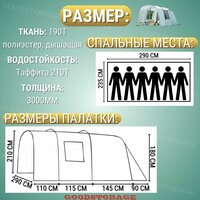 Ищете качественную, просторную палатку для приключений на природе в большой компании? Поздравляем, Вы нашли самую просторную и большую палатку. Палатка туристическая 6 местная, с тамбуром весит около 7 кг. Это позволяет не только перевозить ее, но и нести в руках на большие расстояния. А специальная сумка с ручками, куда вмещается палатка, делает путешествие еще более удобным. Палатка геометрически палатка выглядит как полубочка. Внешне палатка сделана из полиэстера . Тент может выдержать до 3000 мм в. ст. Внутреннее обустройство из полиэтилена 190Т. Каркас выполнен из стеклопластика. Дуги, служащие основой для крепления палатки, имеют диаметр 11 мм. Они надежно крепятся и не дают палатке переворачиваться. Все швы надежно проклеены. Это дает возможность сохраняться теплу внутри помещения. Свежий воздух поступает в палатку постоянно, так как есть три окна и одна вентиляция. Все отверстия и дверь защищены москитной сеткой,