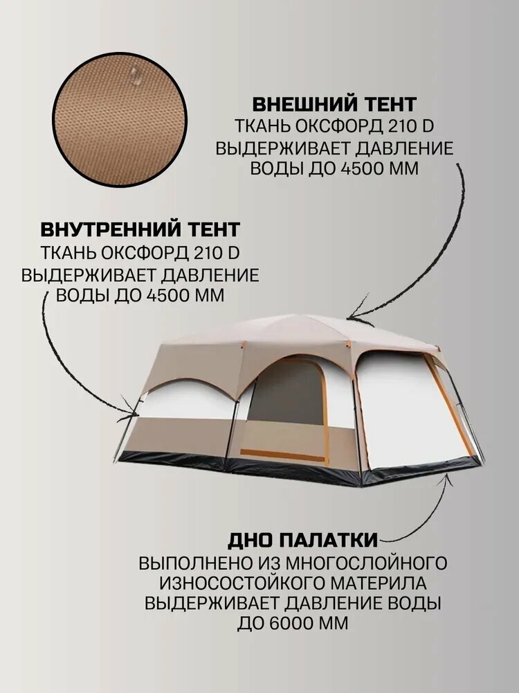Купить Палатка туристическая большая с тамбуром, 8-12 мест, 3 комнаты, Коричневый с доставкой по всей России.