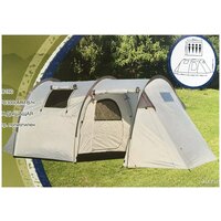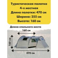 Назначение: кемпинговая. Внутренняя палатка: есть. Количество мест: 4. Тип каркаса: внешний. Геометрия: полубочка. Количество входов / комнат: 1 / 1. Количество тамбуров: 1. Вентиляционные окна: есть. Окна: есть. Штормовые оттяжки: есть. Водостойкость тента: 3000 мм в. ст. Герметизация швов: проклеенные. Противомоскитная сетка: есть. Материал тента: полиэстер (190T PU). Материал дна: полиэтилен (120 гр/м2). Материал внутренней палатки: полиэстер (190T). Материал каркаса: стеклопластик.