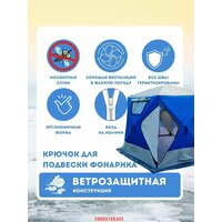 диаметр дуг: 9 мм; длина внутренней палатки: 290 см; ширина внутренней палатки: 290 см; высота внутренней палатки: 205 см; количество вентиляционных отверстий: 2; подробная комплектация: 4 ввертыша для льда, которые не «обжигают» руки на морозе, набор оттяжек, ремкомплект и удобная сумка чехол для хранения и переноски.