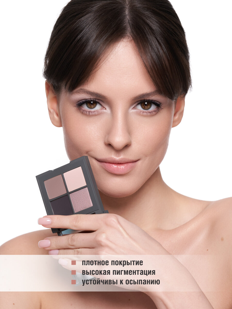 Холодная палитра теней 408 из четырёх оттенков позволит создать потрясающий макияж: как элегантный дневной, так и ослепительный вечерний. Холодные оттенки прекрасно подойдут для любого цвета кожи и глаз. Благодаря особому помолу, тени мягко растушевываются, не осыпаются и совсем не ощущаются. Оттенки в каждой палетке можно наносить как по отдельности так и в растушевке. В состав палетки входит : - серебристый мерцающий оттенок для акцентов и нанесения на все веко - темно-графитовый матовый оттенок с холодным отливом для стрелок и затемнения уголка - светлый бежево-розовый матовый оттенок с мерцающими частицами для нанесения на все веко и высветления - серо-бежевый матовый оттенок для затемнения складки века