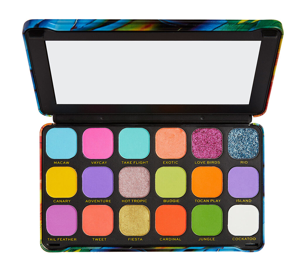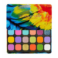Следующая остановка: тропики! Палетка теней для глаз от бренда REVOLUTION MAKEUP FOREVER FLAWLESS Bird of Paradise - это 18 высокопигментированных оттенка в жестяном футляре с ярким принтом оперения райских птиц. В этой палетке вы сможете найти: 1. Солнечные оранжевые и желтые тона; 2. Цвета небесной лазури, свежей зелени и сирени; 3. Ультрамягкие полукремовые глиттеры, которые при нанесении пальцем создают мерцающее покрытие; 4. Большое зеркало для удобства создания любого макияжа глаз. Тени имеют шелковистую текстуру, легко наносятся и растушевываются, позволяя добиться плавных переходов цвета. А гармонично подобранные оттенки идеально сочетаются друг с другом и вдохновляют на создание ярких образов. Палетка теней НЕ тестируется на животных И подходит для веганов! В палетку вошли: -13 матовых оттенков для креативных акцентных макияжей с яркими тенями; -5 сияющих оттенков для расстановки бликов в любом вашем образе. Для наилучшего эффекта используйте базу под тени, а для удаления макияжа глаз рекомендуем двухфазное средство или мицеллярную воду. Сертификат №RU Д-GB. НВ10. В.01203/20 от 02.03.2020.