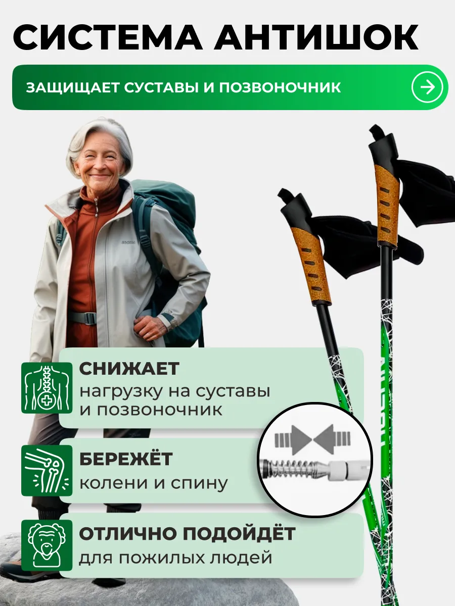 Особенностью палок является система "антишок", которая находится в цанговом соединении внутри самой палки. Она служит для смягчения всех вибраций, передающихся по палке при ходьбе по асфальту или плитке. Это делает ходьбу более комфортной и предотвращает усталость.