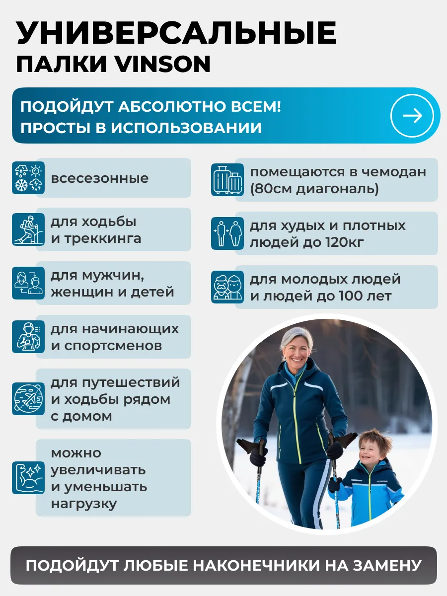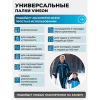 Телескопические палки для северной ходьбы Vinson. Вариант для тех, кто ищет очень компактные палочки по доступной цене. В сложенном виде занимают 85 см пространства. Новый стильный дизайн, а также усовершенствованные темляки-полуперчатки очаруют многих ходоков. Производятся специально для Чехии на заводе в КНР с системой качества TUV. Чтобы с легкостью преодолевать препятствия и максимально безопасно заниматься скандинавской ходьбой, палки снабжены амортизатором "антишок".