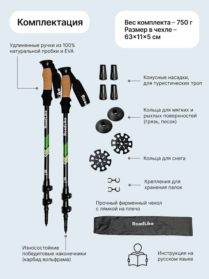 Телескопические; использование: снег, асфальт, пересеченная местность; комплектация: палки - 2шт; кольца для грунта -2шт; кольца для снега - 2шт; резиновые наконечники - 4шт; фирменный чехол - 1шт; инструкция