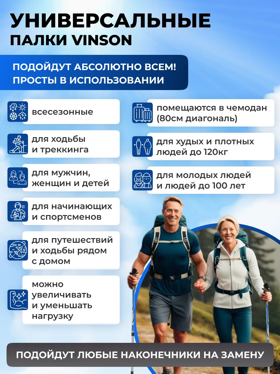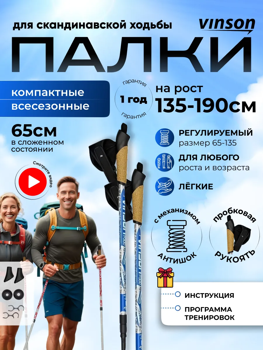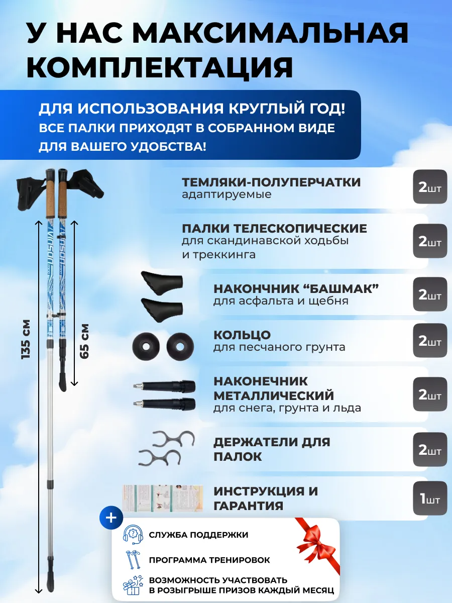 Особенностью этих палок является их телескопическая конструкция, которая позволяет варьировать длину палок от 65 до 135 см, что делает их удобными для использования разными членами семьи.
