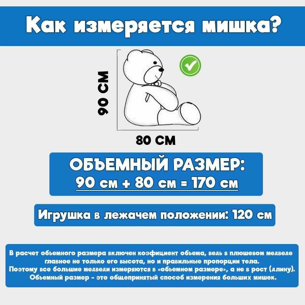 Большая мягкая плюшевая мягкая игрушка панда 170 см. Прекрасно подойдет в подарок для любимого человека. На день рождение, новый год, 14 февраля, 8 марта, день святого Валентина, свидание и просто так. Наполнение (набивка игрушки) - 100% холлофайбер (синтепух). Не вызывает аллергии! Все наши мягкие игрушки изготавливаются из проверенных и качественных материалов. Объемный размер игрушки 170 см. Внимание! Объемный размер измеряется так: от головы до хвоста (по спине) - 90 см, от хвоста до кончиков лап - 80 см. Итого: 170 см. Длина игрушки в человеческий рост - 120 см.