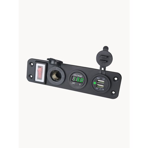 Панель розеток с прикуривателем, дисплеем, 2-мя выходами USB, вольтметром и тумблером переключения. Портативный размер и отличная производительность. Устройство с простой установкой, удобно в использовании. Универсальное назначение - подходит для автомобилей, мотоциклов, моторных лодок, и прочей техники.