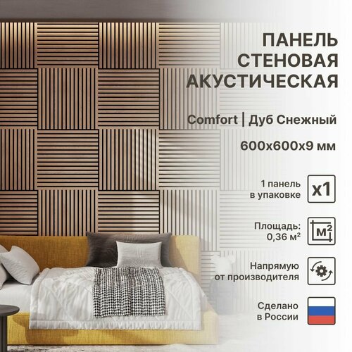 Панель стеновая 3д с рейками акустическая из коллекции Light Comfort 9 в естественном оттенке Дуб Снежный 600х600х9 мм – это идеальное решение для создания комфортной и стильной обстановки в гостиной, спальне, кухне, детской, прихожей (коридоре), зале и даже ванной комнате. Размеры: 27 мм - ширина рейки; шаг между рейками 13 мм; толщина панели 9 мм, где 3 мм слой войлока и 6 мм рейка; длина панели 600 мм. Основное преимущество нашей стеновой панели, что панели могут повторять форму стенки, прямого угла и даже колонны, что позволит использовать их в более широком диапазоне применения. Также главным преимуществом является легкий монтаж на жидкие гвозди. Вы сможете провести монтаж самостоятельно без привлечения специалистов. К тому же наша панель скрывает неровности стен, что позволит создать ровную поверхность. Еще одно преимущество этой панели - ее можно подогнать под нужный размер, так как она легко режется. Это дает вам свободу выбора и удобство при монтаже в отличие от самоклеящейся пвх плитки, пластиковой плиты. Кроме того, акустические свойства панели позволяют снизить эхо и шум в помещении, создавая приятный декор и домашнюю атмосферу. Эта настенная декоративная панель также экологична, так как изготовлена из натуральных материалов из дерева. Она не содержит вредных веществ, не выделяет вредных паров или запахов. Деревянные панели на стену имеет сертификат качества, что гарантирует высокое качество, обеспечивающее долговечность и надежность панели. Еще одно преимущество этой панели - экономия на строительных работах. Цвет Дуб Снежный является классическим и универсальным, что позволяет легко вписать панель в любой стиль интерьера. Выводя все вышеперечисленные преимущества, стеновые не самоклеящиеся панели является отличным выбором для обновления интерьера вашего дома. Она объединяет в себе стильный дизайн, удобство монтажа, шумоизоляционные свойства, экологичность и сертифицированное качество. В упаковке - 1 шт.