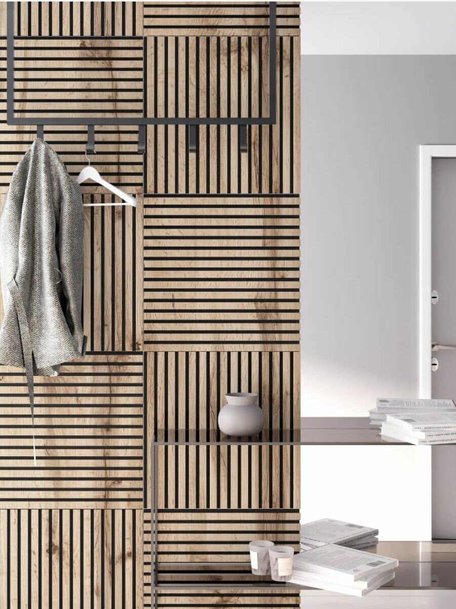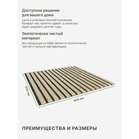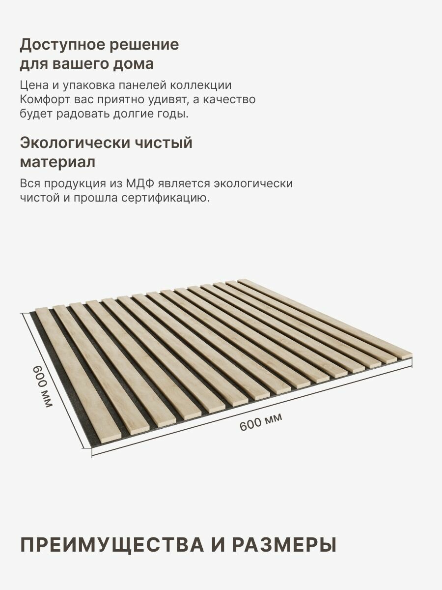 Панель стеновая 3д с рейками акустическая из коллекции Standart Comfort 9 в цвете Дуб Сонома 600х600х9 мм – это идеальное решение для создания комфортной и стильной обстановки в гостиной, спальне, кухне, детской, прихожей (коридоре), зале и даже ванной комнате. Размеры: 27 мм - ширина рейки; шаг между рейками 13 мм; толщина панели 9 мм, где 3 мм слой войлока и 6 мм рейка; длина панели 600 мм. Основное преимущество нашей стеновой панели, что панели могут повторять форму стенки, прямого угла и даже колонны, что позволит использовать их в более широком диапазоне применения. Также главным преимуществом является легкий монтаж на жидкие гвозди. Вы сможете провести монтаж самостоятельно без привлечения специалистов. К тому же наша панель скрывает неровности стен, что позволит создать ровную поверхность. Еще одно преимущество этой панели - ее можно подогнать под нужный размер, так как она легко режется. Это дает вам свободу выбора и удобство при монтаже в отличие от самоклеящейся пвх плитки, пластиковой плиты. Кроме того, акустические свойства панели позволяют снизить эхо и шум в помещении, создавая приятный декор и домашнюю атмосферу. Эта настенная декоративная панель также экологична, так как изготовлена из натуральных материалов из дерева. Она не содержит вредных веществ, не выделяет вредных паров или запахов. Деревянные панели на стену имеет сертификат качества, что гарантирует высокое качество, обеспечивающее долговечность и надежность панели. Еще одно преимущество этой панели - экономия на строительных работах. Цвет Дуб Сонома является классическим и универсальным, что позволяет легко вписать панель в любой стиль интерьера. Выводя все вышеперечисленные преимущества, стеновые не самоклеящиеся панели является отличным выбором для обновления интерьера вашего дома. Она объединяет в себе стильный дизайн, удобство монтажа, шумоизоляционные свойства, экологичность и сертифицированное качество. В упаковке - 1 шт.