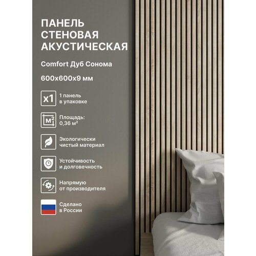 Панель стеновая 3д с рейками акустическая из коллекции Standart Comfort 9 в цвете Дуб Сонома 600х600х9 мм – это идеальное решение для создания комфортной и стильной обстановки в гостиной, спальне, кухне, детской, прихожей (коридоре), зале и даже ванной комнате. Размеры: 27 мм - ширина рейки; шаг между рейками 13 мм; толщина панели 9 мм, где 3 мм слой войлока и 6 мм рейка; длина панели 600 мм. Основное преимущество нашей стеновой панели, что панели могут повторять форму стенки, прямого угла и даже колонны, что позволит использовать их в более широком диапазоне применения. Также главным преимуществом является легкий монтаж на жидкие гвозди. Вы сможете провести монтаж самостоятельно без привлечения специалистов. К тому же наша панель скрывает неровности стен, что позволит создать ровную поверхность. Еще одно преимущество этой панели - ее можно подогнать под нужный размер, так как она легко режется. Это дает вам свободу выбора и удобство при монтаже в отличие от самоклеящейся пвх плитки, пластиковой плиты. Кроме того, акустические свойства панели позволяют снизить эхо и шум в помещении, создавая приятный декор и домашнюю атмосферу. Эта настенная декоративная панель также экологична, так как изготовлена из натуральных материалов из дерева. Она не содержит вредных веществ, не выделяет вредных паров или запахов. Деревянные панели на стену имеет сертификат качества, что гарантирует высокое качество, обеспечивающее долговечность и надежность панели. Еще одно преимущество этой панели - экономия на строительных работах. Цвет Дуб Сонома является классическим и универсальным, что позволяет легко вписать панель в любой стиль интерьера. Выводя все вышеперечисленные преимущества, стеновые не самоклеящиеся панели является отличным выбором для обновления интерьера вашего дома. Она объединяет в себе стильный дизайн, удобство монтажа, шумоизоляционные свойства, экологичность и сертифицированное качество. В упаковке - 1 шт.