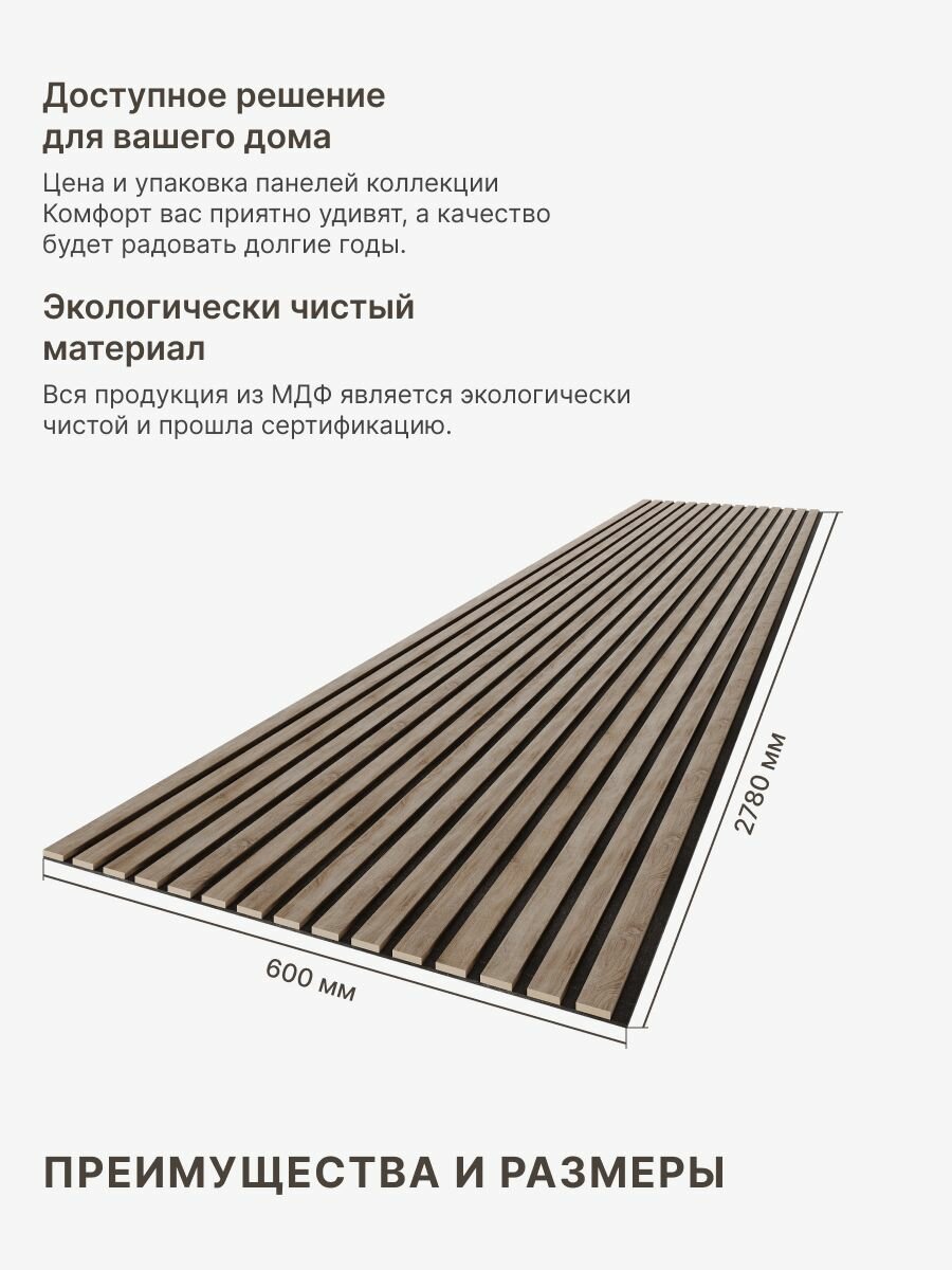 Панель стеновая 3д с рейками акустическая из коллекции Standart Comfort в цвете Дуб Винтаж 2780х600х9 мм – это идеальное решение для создания комфортной и стильной обстановки в гостиной, спальне, кухне, детской, прихожей (коридоре), зале и даже ванной комнате. Размеры: 27 мм - ширина рейки; шаг между рейками 13 мм; толщина панели 9 мм, где 3 мм слой войлока и 6 мм рейка; длина панели 2780 мм. Основное преимущество нашей стеновой панели, что панели могут повторять форму стенки, прямого угла и даже колонны, что позволит использовать их в более широком диапазоне применения. Также главным преимуществом является легкий монтаж на жидкие гвозди. Вы сможете провести монтаж самостоятельно без привлечения специалистов. К тому же наша панель скрывает неровности стен, что позволит создать ровную поверхность. Еще одно преимущество этой панели - ее можно подогнать под нужный размер, так как она легко режется. Это дает вам свободу выбора и удобство при монтаже в отличие от самоклеящейся пвх плитки, пластиковой плиты. Кроме того, акустические свойства панели позволяют снизить эхо и шум в помещении, создавая приятный декор и домашнюю атмосферу. Эта настенная декоративная панель также экологична, так как изготовлена из натуральных материалов из дерева. Она не содержит вредных веществ, не выделяет вредных паров или запахов. Деревянные панели на стену имеет сертификат качества, что гарантирует высокое качество, обеспечивающее долговечность и надежность панели. Еще одно преимущество этой панели - экономия на строительных работах. Цвет Дуб Винтаж является классическим и универсальным, что позволяет легко вписать панель в любой стиль интерьера. Выводя все вышеперечисленные преимущества, стеновые не самоклеющиеся панели является отличным выбором для обновления интерьера вашего дома. Она объединяет в себе стильный дизайн, удобство монтажа, шумоизоляционные свойства, экологичность и сертифицированное качество. В упаковке - 1 шт.