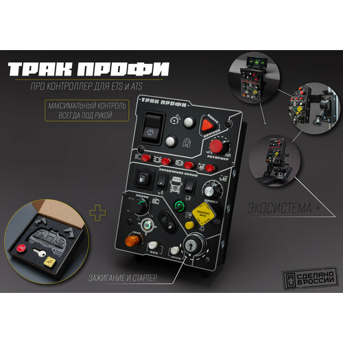 Как можно не влюбиться в Euro Truck Simulator и American Truck Simulator? Имея опыт в симрейсинге и в любых других компьютерных играх, пожалуй, только ETS 2 и ATS дарят настоящее расслабление в игре. Зачастую дальние виртуальные рейсы можно сравнить с терапией. Тысячи километров, приятная музыка, звуки двигателя, дороги и прицепа складываются в единый расслабляющий фон. После ETS 2 мы не находимся в раздраженном состоянии, не переживаем о не поставленных рекордах, о сходах с дистанции, мы разменяли наше время – на радость и комфорт. Баттонбокс для ПК "Трак Профи" является уникальным устройством, созданным и вдохновленным исключительно играми ETS 2 и ATS. Трак профи не хочет быть универсальной панелью управления для симрейсинга, в ней всё говорит о её предназначении. От использования переключателей реального автомобилестроения, до каждой иконки выгравированной на анодированном алюминии, вы поймете - это изделие сделано с любовью к симуляторам виртуальных грузоперевозок. Корпус баттонбокса устройства выполнен на 100% из холоднокатаной стали, детали перед устойчивым порошковым окрашиванием обрабатываются в ручную. Эту панель управления для ETS можно с комфортом разместить как на столах, при помощи кронштейна «Крокодил» или Струбцины PRO, так и на кокпитах при помощи наших поворотных кронштейнов. Электроника устройства позволяет подключаться к ПК без необходимости установки драйверов. Так же одной из дополнительных опций, является возможность подключения кастомных односигнальных устройств. Это решение позволяет использовать ручные тормоза для ПК, переключатели демультипликатора, и другие необходимые устройства и функции, которые можно просто завести в панель. Панель управления для ETS 2 "Трак Профи" - это устройство созданное для людей которые уже прошли определенный путь в автосимах, для тех, кто уже выбрал свой основной симулятор, и хотел бы порадовать себя уникальным устройством. Внимание: одновременно работать на котроллере может только 1 переключатель с фиксацией (заправка, тумблер сцепки или ручной тормоз).