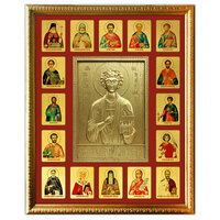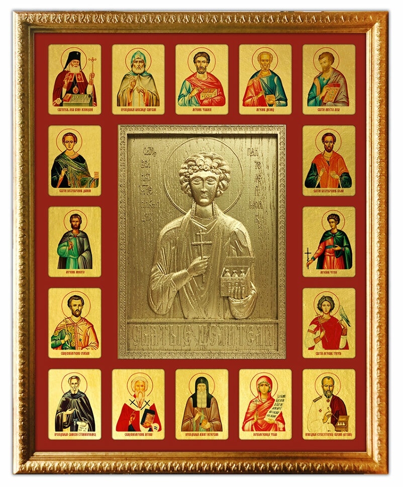 Панно изготовлено вручную с использованием пластин, покрытых сусальным золотом. На панно изображены особо почитаемые в православии целители, которые при жизни мирской были врачами или исцеляли людей. В шестнадцати малых окошках содержатся изображения: Святителя Луки Войно-Ясенецкого, Преподобного Александра Свинского, Мученика Фалалея, Мученика Диомида, Святого Апостола Луки, Святых бессребреников Космы и Дамиана, Мучеников Аникиты и Фотия, Священномученика Ермолая, Святого мученика Трифона, Преподобного Сампсона Странноприимца, Священномученика Антипы, Преподобного Агапита Печерского, Первомученицы Фёклы и Праведного страстотерпца Евгения (Боткина). Центральная, большая литая вставка содержит изображение "Святого Пантелеймона целителя". Панно снабжено бархатным паспарту и золотой рамой. Для крепления на стену на обороте панно имеется металлическая скоба.