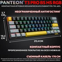 PANTEON T3 PRO BS HS RGB – механическая игровая клавиатура с RGB-подсветкой. Трендовый игровой форм-фактор копуса TKL (60%) придется по душе любителям гейминга. При этом, несмотря на сокращенное количество клавиш, функционал полноразмерной клавиатуры сохранен благодаря сочетаниям мультифункциональных клавиш с клавишей FN. Клавиши PANTEON T3 PRO BS HS RGB работают на линейных чёрных свитчах JIXIAN Black Switches, которые отличаются бóльшим усилием на нажатие (около 60 г), благодаря которому многие геймеры предпочитают именно их. Такой показатель обеспечивает защиту от случайных нажатий во время игры, а также прекрасные тактильные ощущения. Hot Swap - опция, которая позволяет быстро и без проблем заменить вышедший из строя свитч или установить свитч другого цвета. Активация стрелок После подключения клавиатуры активируется предустановленный режим работы. В этом режиме клавиши «Alt», «Ctrl», «Меню» и «/,» работают в базовом режиме. Для того, чтобы активировать стрелки, необходимо нажать и удерживать 3 секунды сочетание клавиш FN + правый SHIFT (пока клавиши «Alt», «Ctrl», «Меню» и «/,» не замигают). Возврат к основным функциям клавиш производится также сочетанием клавиш FN + правый SHIFT. Подсветка FULL RGB Сочетание клавиш FN+Tab позволяет переключаться между 18 предустановленными многоцветными режимами свечения. При помощи сочетания FN+Enter можно переключать предустановленные статические однотонные режимы подсветки. Всего доступно 8 цветов. Анти-гостинг Неограниченный анти-гостинг открывает широчайшие игровые возможности — нажатие на каждую клавишу анализируется платой отдельно. Благодаря этому при управлении игровыми действиями можно одновременно нажимать любое количество клавиш. Программное обеспечение Фирменный софт позволяет тонко настраивать клавиатуру - менять функционал клавиш, записывать собственные макросы и настраивать подсветку. ПО доступно в разделе “Скачать ПО”.