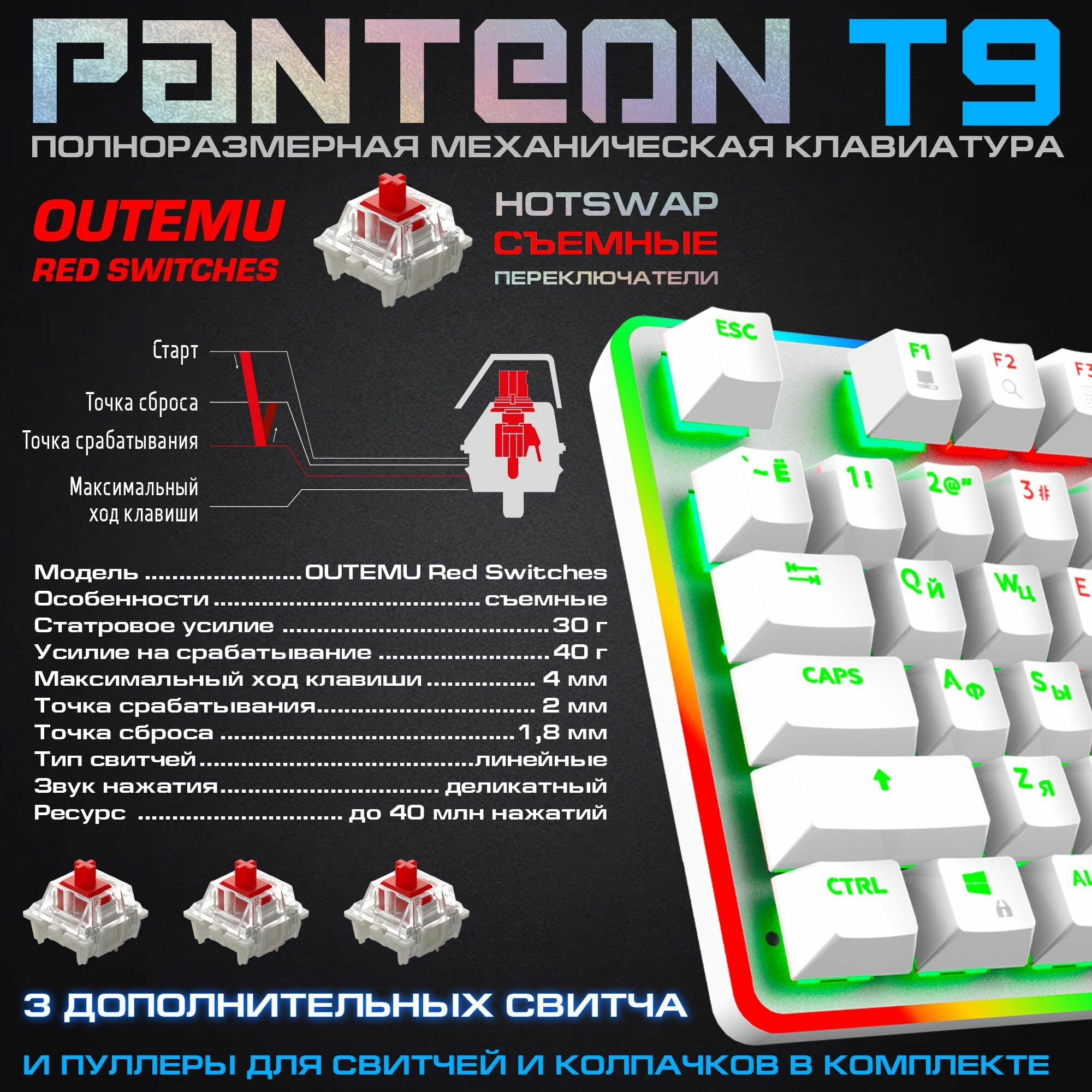 PANTEON T9 White (146) Проводная механическая игровая клавиатура PANTEON T9 ( OUTEMU Red, 104+4 кл, Hot Swap, USB): сравнение цен, характеристики, фото, актуальное наличие и цены.
