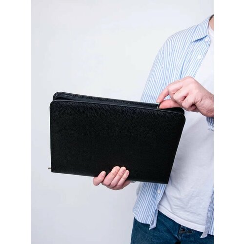 Распашная папка закрывается на круговую молнию с двумя молниеводителями. Внутри по одной половине карман для бумаг и блокнот. На другой половине объемный карман на кнопке с двумя отделениями. На кармане прорезной карман на молнии и 3 маленьких кармашка.