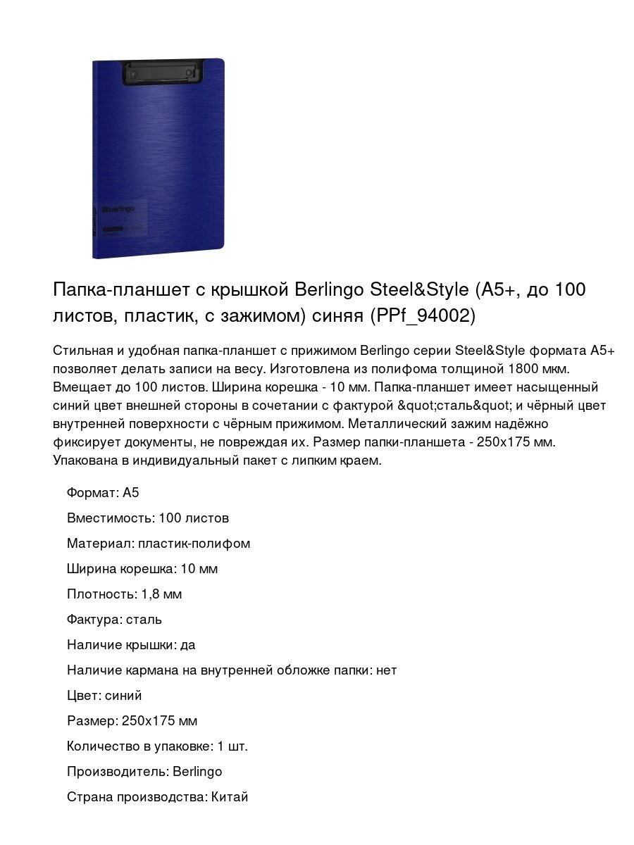 Выбирая папку-планшет Berlingo "Steel&Style", вы получаете стильный и функциональный аксессуар, который поможет вам организовать документы и поддерживать порядок на рабочем месте.
