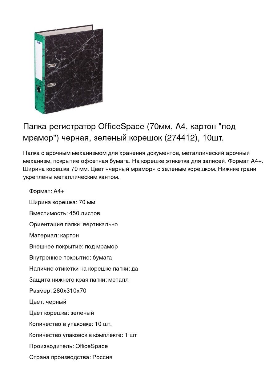 Папки OfficeSpace выполнены в стильном черном цвете с мраморным покрытием и зеленым корешком, что придает им элегантный и современный вид. В упаковке вы найдете 10 папок, что позволит вам организовать документы на рабочем месте или дома.