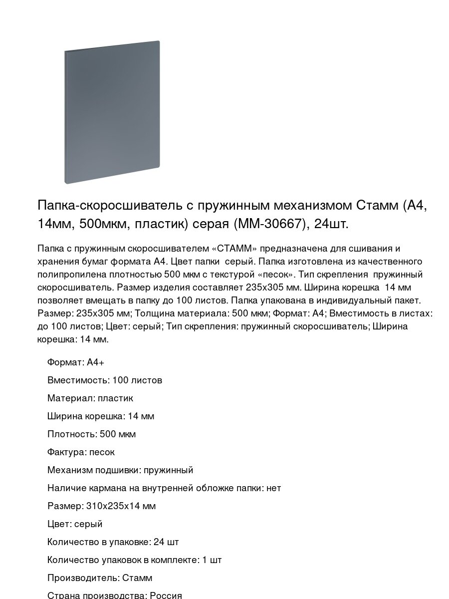 Папка-скоросшиватель с пружинным механизмом Стамм (А4, 14мм, 500мкм, пластик) серая (ММ-30667), 24шт.: сравнение цен, характеристики, фото, актуальное наличие и цены.