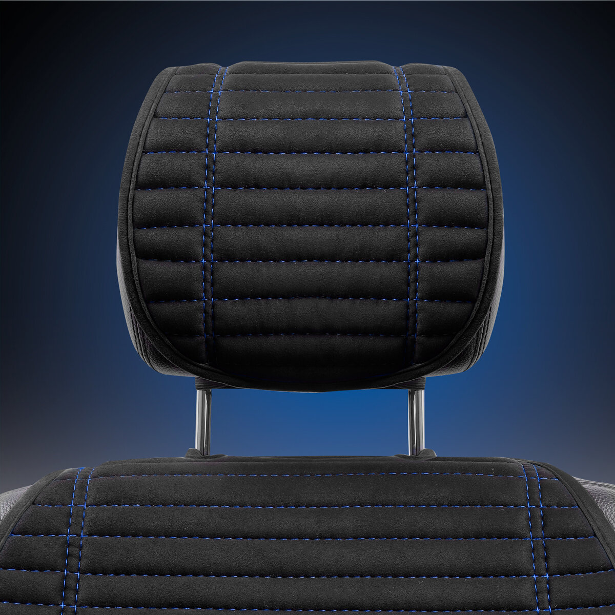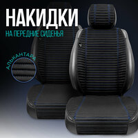 Купить Чехлы в машину на сиденья универсальные в салон. 2шт. Модель L POLOSA. Чёрный/синяя строчка с доставкой по всей России.