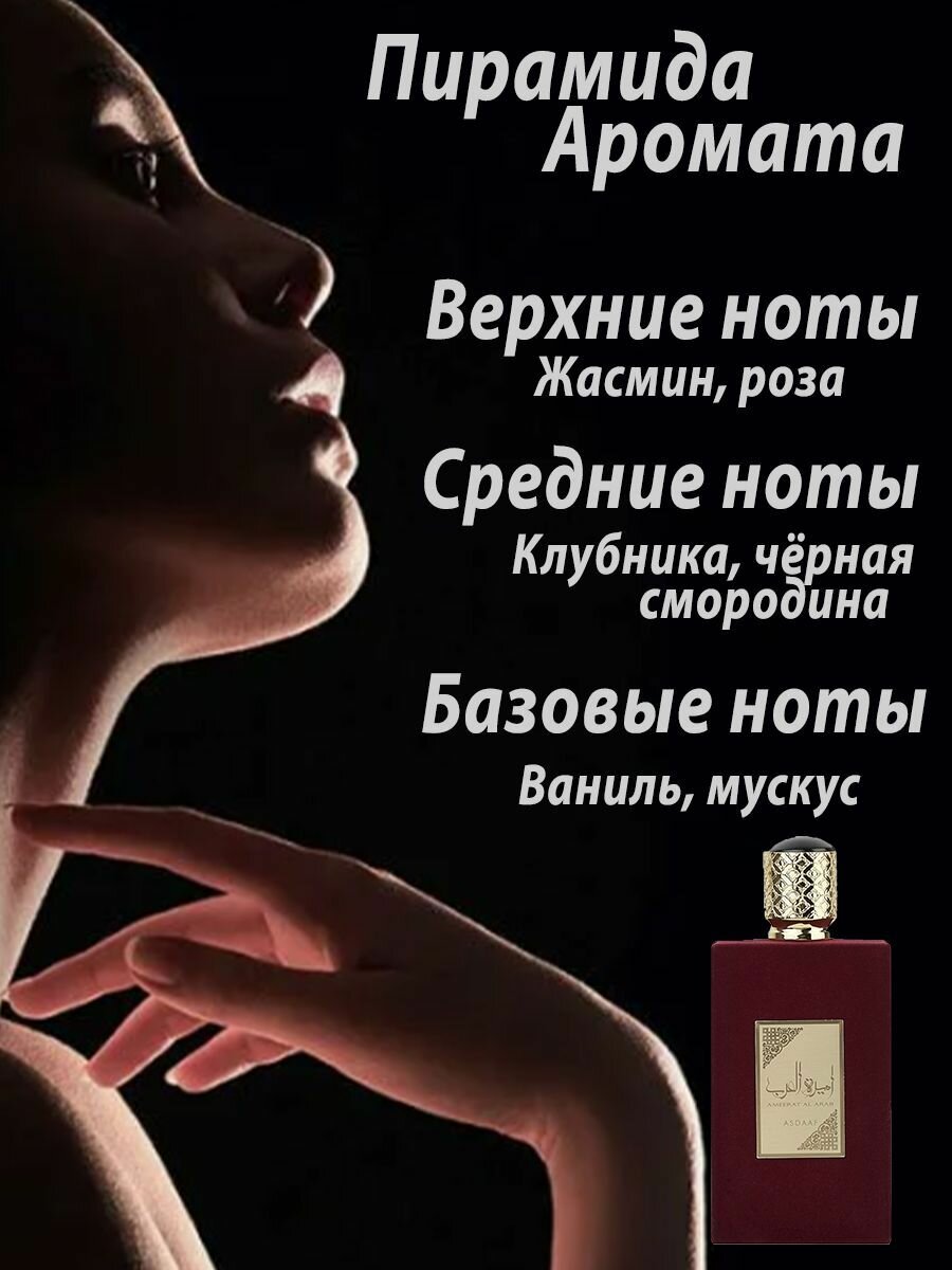 Lattafa Asdaaf Ameerat Al Arab — волнующий и обволакивающий цветочно-фруктовый унисекс-парфюм с мягкими и сексуальными кожаными полутонами, выпущенный арабским парфюмерным брендом Lattafa. Аромат обладает ярким, шлейфовым звучанием, способным украсить как женский, так и мужской образ. Верхний аккорд парфюма Asdaaf Ameerat Al Arab дарит аромат душистой спелой клубники и терпковатую сладость черной смородины. Сердце композиции дарит волнующий букет цветочных нот медового жасмина и шелковисто-пряной розы. Отзвучав, яркий букет цветочных нот медленно и грациозно тает в мягкой и чувственной базе композиции Lattafa Asdaaf Ameerat Al Arab, сплетенной из тонкого запаха замши, волнующего мускуса и нежнейшей сладости ванили.